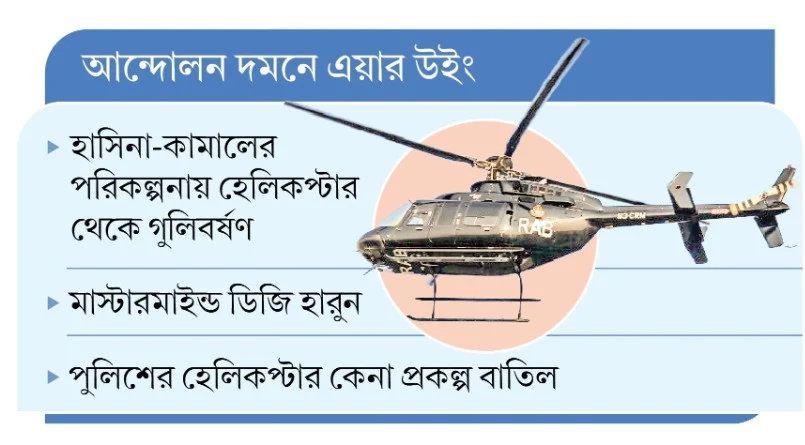 আমার দেশ-এর অনুসন্ধানে আরও জানা গেছে, র্যাবের এয়ার উইং ব্যবহার করে যুক্তরাষ্ট্রের তৈরি বেল ৪০৭ হেলিকপ্টার দিয়ে গুলি চালায় র্যাব। এই ধরনের দুটি হেলিকপ্টার রয়েছে র্যাবের। জুলাই গণঅভ্যুত্থান দমনে র্যাবের এই হেলিকপ্টার ব্যবহারের মাত্রা ১৩ জুলাই থেকে বাড়তে থাকে। গুলিবর্ষণের পাশাপাশি হেলিকপ্টার দিয়ে র্যাব-পুলিশ সদস্যদের উদ্ধার অভিযানও চালানো হয়।
