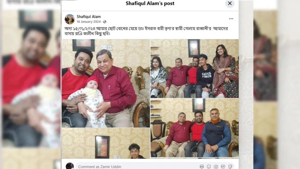 আন্দোলনে সংগঠনের নেতৃত্ব দেওয়া এবিএম শফিকুল আলম ২০২৪ সালের ১৬ জানুয়ারি তার নিজস্ব ফেসবুকে লিখেন, আমার ছোট বোনের মেয়ে ডা. ইসরাত বারী তৃণা’র স্বামী গোলাম রাব্বানী আমাদের বাসায়। রাতের কিছু ছবি।