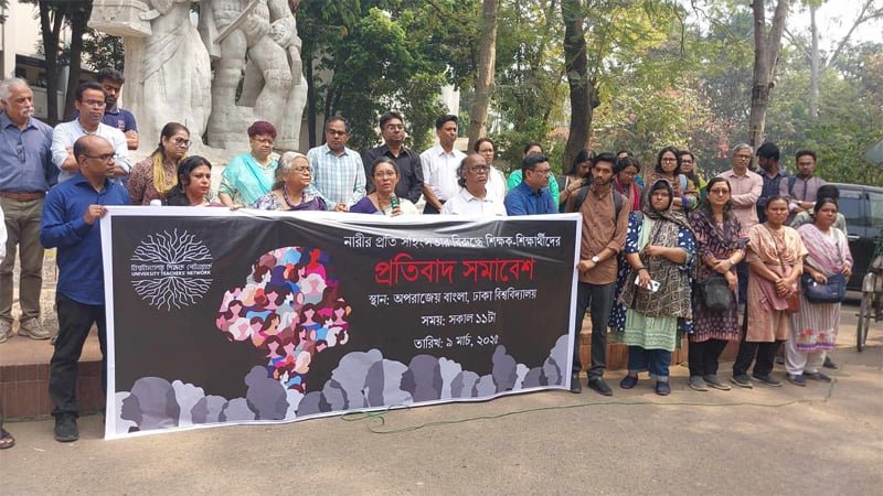 নারীর প্রতি সহিংসতার বিরুদ্ধে প্রতিবাদ সমাবেশ করেছেন ঢাকা বিশ্ববিদ্যালয়ের (ঢাবি) শিক্ষক-শিক্ষার্থীরা। আজ রোববার সকাল ১১টার দিকে বিশ্ববিদ্যালয়ের অপরাজেয় বাংলার পাদদেশে এই সমাবেশ করেন তারা।