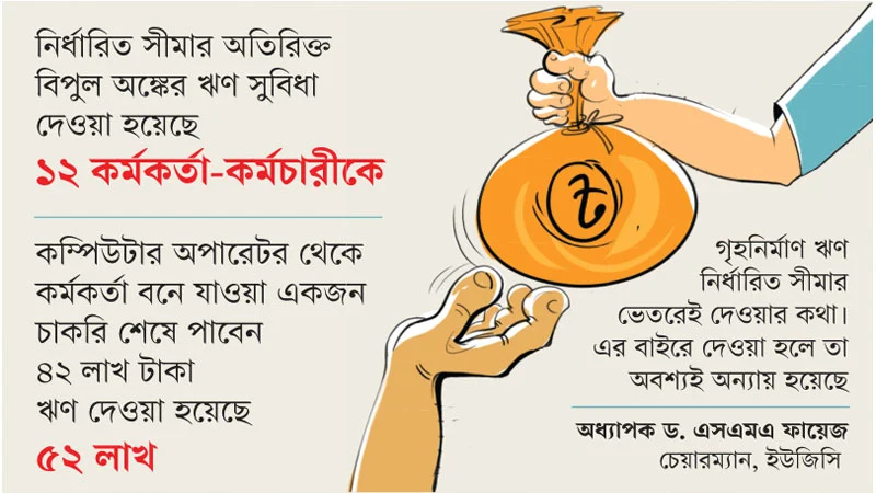 অনুসন্ধানে জানা গেছে, নিয়মনীতির তোয়াক্কা না করে কর্মকর্তাদের বাড়ি নির্মাণে অন্তত দেড় কোটি টাকা অতিরিক্ত ঋণ দিয়েছে ইউজিসি। প্রাপ্যতার অতিরিক্ত টাকা নেওয়া কর্মকর্তাদের কাছে বিষয়টির ব্যাখ্যা চেয়েছে শিক্ষা অডিট অধিদপ্তর।