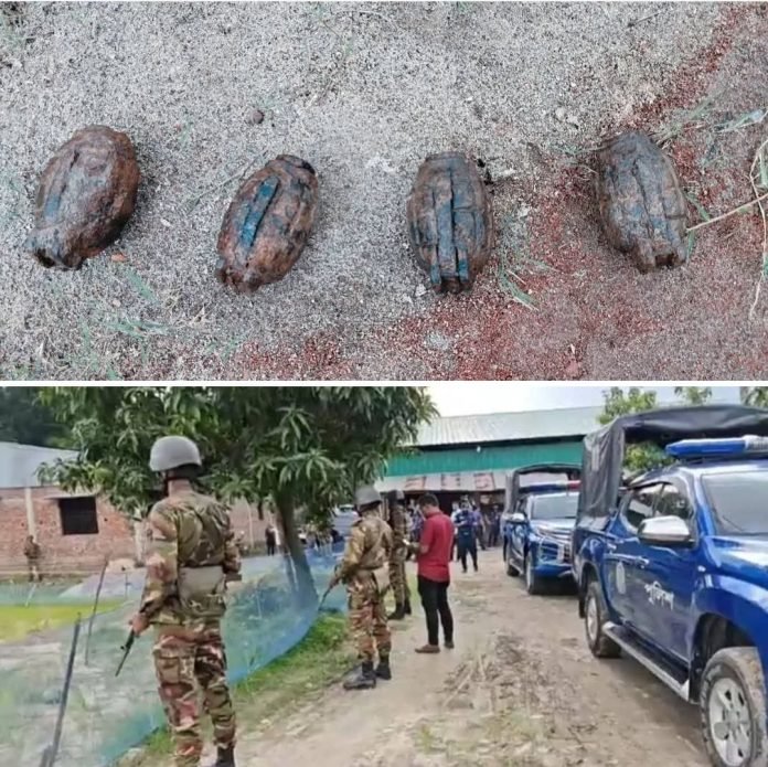 খবর পেয়ে পুলিশ ঘটনাস্থলে গিয়ে প্রথমে চারটি হাতবোমা ও পড়ে আরও দুইটিসহ মোট ৬টি সদৃশ বস্তু উদ্ধার করে নিরাপদ স্থানে সরিয়ে নেয়।