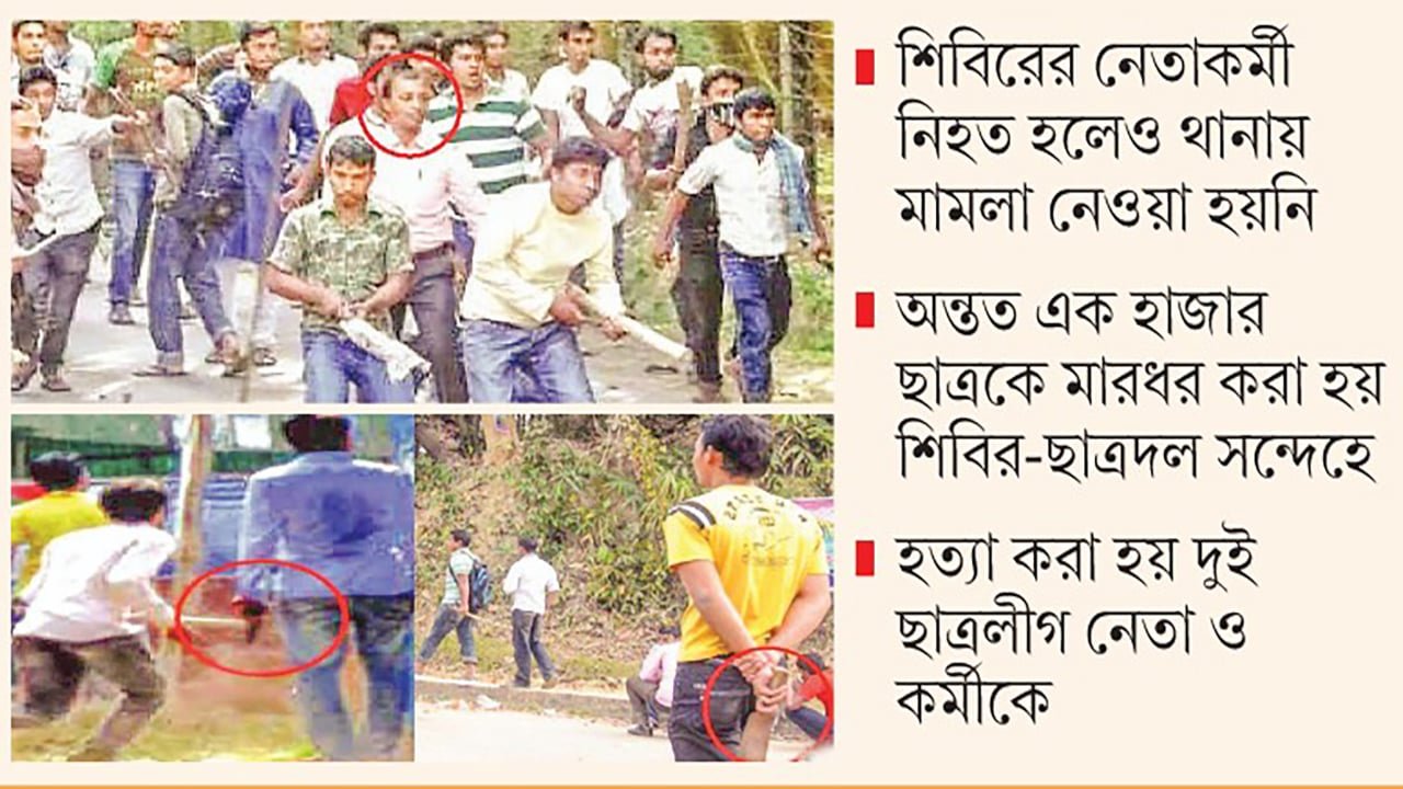 তিনি আরো বলেন, এ সময় ছাত্রলীগ অন্তত ১৫ বার আমাদের কর্মীদের সঙ্গে সংঘর্ষে জড়ায়। সংঘর্ষ ছাড়াও প্রায় নিয়মিতই শিবিরকর্মীদের ওপর হামলা হয়েছে। শুধু শিবিরই নয়, সাধারণ শিক্ষার্থীরাও মারধরের শিকার হয়েছেন।