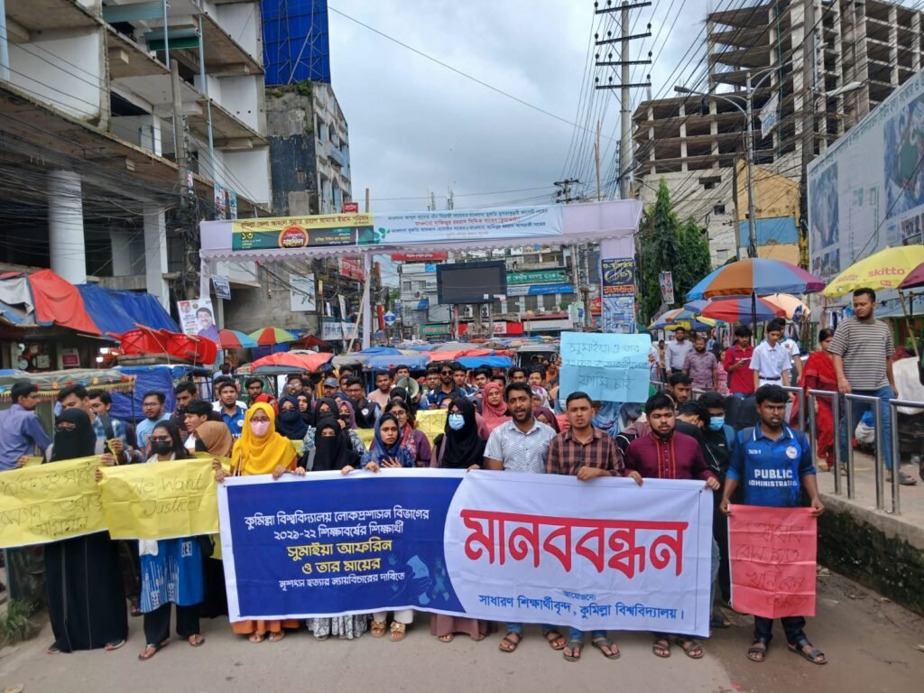 সোমবার (১৫ সেপ্টেম্বর) দুপুরে বিশ্ববিদ্যালয়ের কয়েক শতাধিক শিক্ষার্থী নগরীর কান্দিরপাড় পূবালি চত্বর থেকে বিক্ষোভ মিছিল শুরু করে। পরে মিছিলটি প্রধান সড়ক প্রদক্ষিণ করে কুমিল্লা আদালত প্রাঙ্গণে গিয়ে শেষ হয়। সেখানে তারা মানববন্ধন কর্মসূচি পালন করেন।