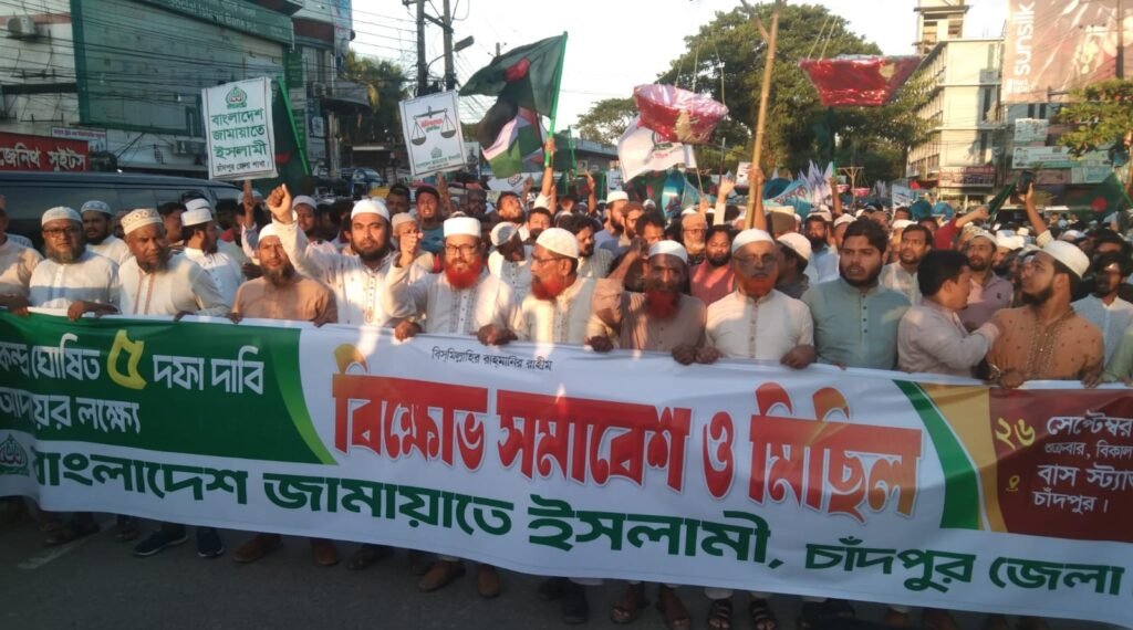 মাহমুদ হাসান, চাঁদপুর প্রতিনিধি: বাংলাদেশ জামায়াতে ইসলামী চাঁদপুর শহর ও সদর উপজেলা শাখার উদ্যোগে পাঁচ দফা গণদাবি আদায়ের লক্ষ্যে বিক্ষোভ মিছিল ও সমাবেশ অনুষ্ঠিত হয়েছে।