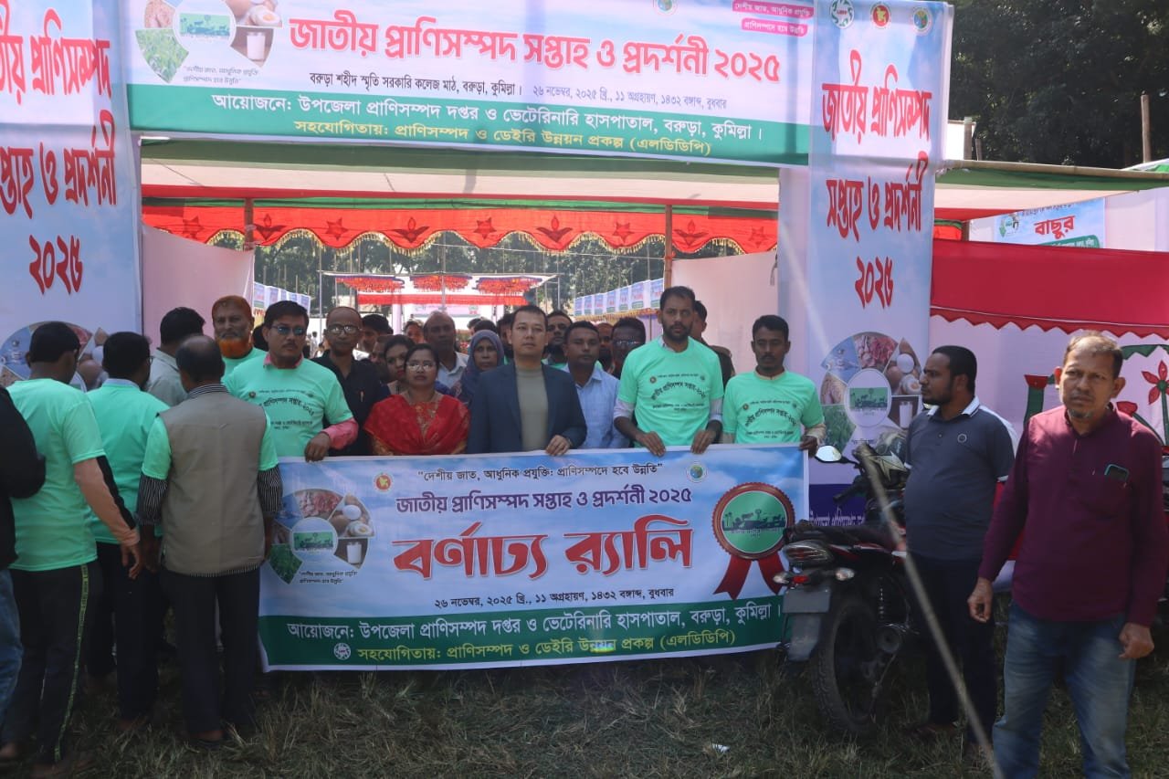 কুমিল্লার বরুড়া উপজেলায় উৎসবমুখর পরিবেশে পালিত হয়েছে জাতীয় প্রাণিসম্পদ সপ্তাহ ও প্রদর্শনী ২০২৫। বুধবার (২৬ নভেম্বর) বরুড়া শহীদ স্মৃতি সরকারি কলেজ মাঠে উপজেলা প্রাণিসম্পদ অধিদপ্তরের আয়োজনে এই প্রদর্শনীর মাধ্যমে স্থানীয় খামারিদের মধ্যে আধুনিক খামার ব্যবস্থাপনা ও উন্নত জাতের পশুপালনের বিষয়ে সচেতনতা মূলক সভা অনুষ্ঠিত হয়।