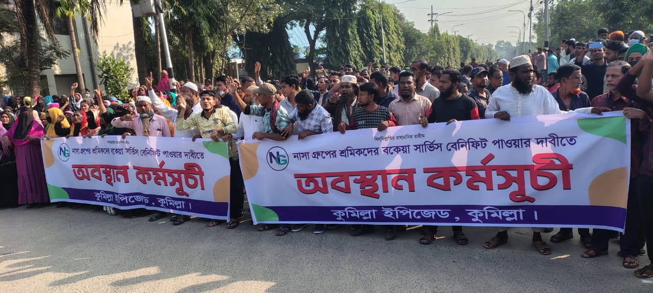 কুমিল্লা এক্সপোর্ট প্রসেসিং জোন (ইপিজেড)–এর ১ নম্বর ফটকের সামনে বকেয়া বেতন–ভাতা পরিশোধ ও পুনরায় কর্মস্থলে ফিরে যাওয়ার দাবিতে বিক্ষোভ মিছিল ও মানববন্ধন করেছেন নাসা গ্রুপের বিভিন্ন কারখানার শ্রমিকরা। রোববার (৩০ নভেম্বর) সকাল সাড়ে ৭টা থেকে শ্রমিকরা ফটকের সামনে জড়ো হতে থাকেন এবং সকাল ৮টা ৩০ মিনিটে তারা মানববন্ধন শুরু করেন। পরে এতে বিক্ষোভ মিছিল যুক্ত হয়।