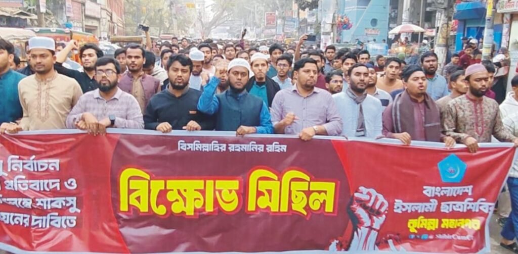 সমতট ডেস্ক : সিলেটের শাহজালাল বিজ্ঞান ও প্রযুক্তি বিশ্ববিদ্যালয় কেন্দ্রীয় ছাত্র সংসদ (শাকসু) নির্বাচন স্থগিত ও অবিলম্বে নির্বাচন দেয়ার দাবিতে বিক্ষোভ মিছিৱ করেছে বাংলাদেশ ইসলামী ছাত্র শিবির কুমিল্লা মহানগরী। মঙ্গলবার(২১ জানুয়ারী) বিকেল ৫টায় ইসলামী ছাত্র শিবির কুমিল্লা মহানগরীর ব্যানারে নগরীর সালাউদ্দিন মোড় থেকে পূবালী চত্ত্বর এলাকায় শাকসু নির্বাচন স্থগিত ও নির্বাচন দেওয়ার দাবিতে বিক্ষোভ মিছিল অনুষ্ঠিত হয়। বিক্ষোভ মিছিল শেষে সংক্ষিপ্ত সমাবেশও করেন দলীয় নেতৃবৃন্দরা।