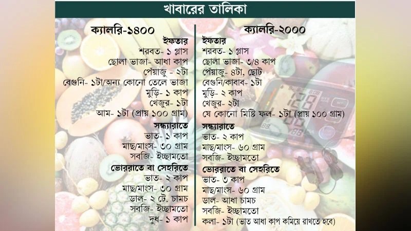 এদিকে অন্যান্য উপাদানে তেলের ব্যবহার বেশি হয় বলে খাবারে ক্যালরির মাত্রা বেড়ে যায়। এ জন্য যতটা সম্ভব তেল কমাতে পারলে ভালো হয়। রুচি বদলানোর জন্য একেক দিন একেক ধরনের ডাল দিয়ে পেঁয়াজু করে খাওয়া যায়। আবার ডালের সঙ্গে আলু কুচি, বেগুন কুচি, লাউ বা পেঁপে কুচি অথবা ময়দার সঙ্গে যে কোনো শাকের বড়া তৈরি করে খাওয়া যায়। ময়দার পরিবর্তে বেসনও ব্যবহার করা যায়। যদি ইফতারের প্লেটে সবজির তৈরি খাবার রাখা যায়, এতে যেমন স্বাদ বদলানো যায়, তেমনি সবজি খাওয়ারও একটা সুযোগ তৈরি হয়। ইফতারে কাঁচা ছোলা খাওয়াও স্বাস্থ্যসম্মত। বিদেশি ফলের ওপর নির্ভর না করে ইফতারে আম, পেয়ারা, কলা, পাকা পেঁপে, আনারস খেলে ভালো হয়। খেজুরে রয়েছে প্রচুর লৌহ। ইফতারের প্লেটে দুটি খেজুর সে অভাব মেটাতে পারে। সন্ধ্যারাতের খাবার– সারাদিনের উপবাসের পর মানুষ ইফতার করেন বেশ তৃপ্তি সহকারে। এখনও সন্ধ্যারাতের খাবারের তেমন আগ্রহ থাকে না। এ সময়ের খাবার হালকা হওয়া উচিত। মাংসের চেয়ে হালকা মসলা সহযোগে ছোট ও বড় যে কোনো মাছ খাওয়া যেতে পারে। সঙ্গে নিরামিষ থাকলে ভালো হয়। আবার যে কোনো ধরনের ভর্তা খেলেও খাবারে রুচি আসবে। অনেক সময় রক্তে স্টেরয়েড জাতীয় ওষুধও প্রয়োগ করা লাগতে পারে।