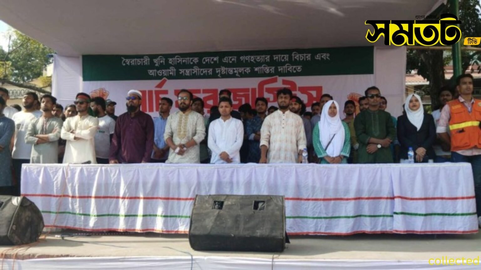 গণহত্যার দায়ে অভিযুক্ত ও ক্ষমতাচ্যুত প্রধানমন্ত্রী শেখ হাসিনা এবং তার দল আওয়ামী লীগের বিচার দাবি করে দৃঢ় শপথ নিয়েছেন কুমিল্লার শিক্ষার্থীরা। বৃহস্পতিবার (১৫ আগস্ট) বিকেলে কুমিল্লা টাউন হল মাঠে বৈষম্যবিরোধী ছাত্র আন্দোলনের আয়োজনে অনুষ্ঠিত ‘মার্চ ফর জাস্টিস’ কর্মসূচিতে শিক্ষার্থীরা ঘোষণা দেন, “রাজপথে জীবন দিয়ে দেশের ছাত্র সমাজ স্বৈরাচার হটিয়েছে। তাই খুনিদের বিচার না হওয়া পর্যন্ত আমরা ঘরে ফিরবো না।”